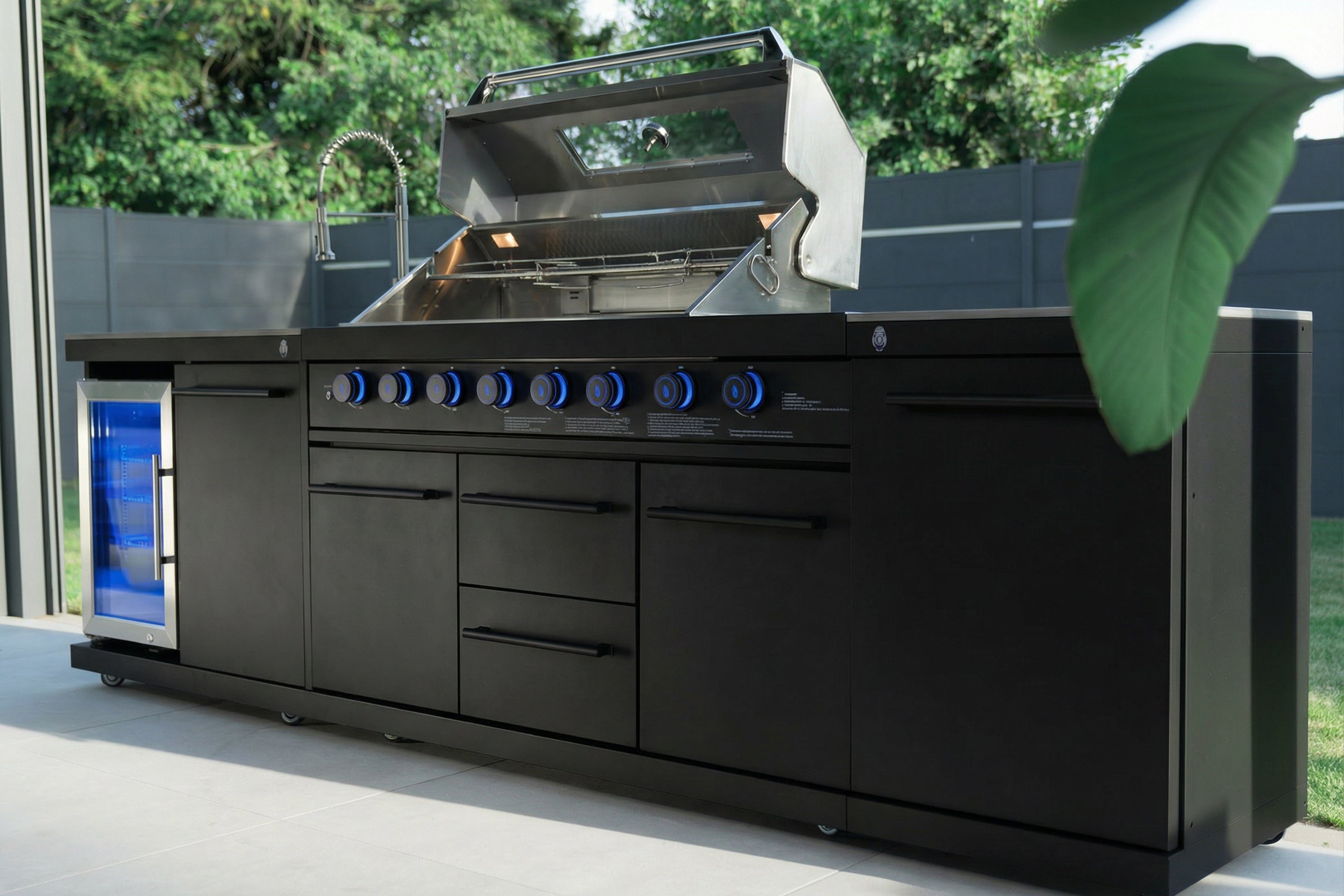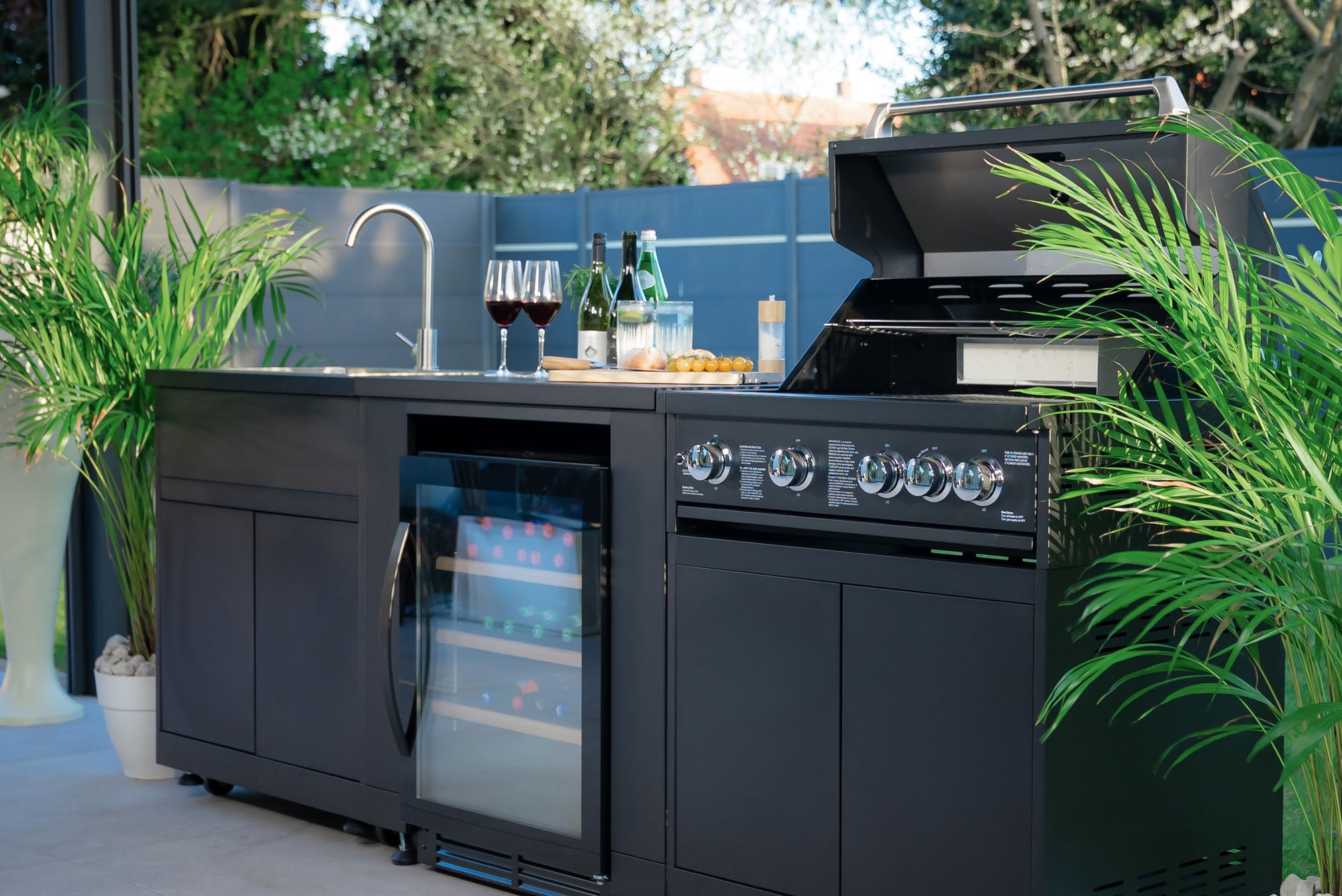 Ein Traum in Matt-Schwarz - kompakte All-In-One Küchen für das perfekte Grillerlebnis auf kleinem Raum.
