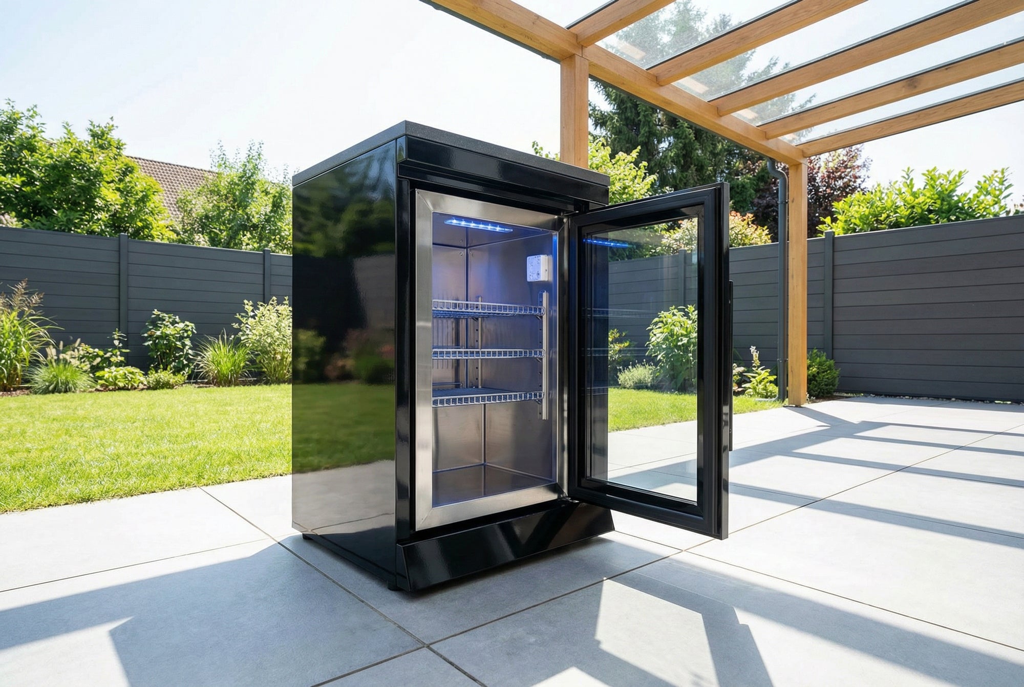 Maximum freshness in the smallest possible space: The COOL-SOLO is the solution for anyone who needs to save space. With a cooling capacity of 63 liters You have enough space for several large and small bottles, barbecue food, and fresh side dishes – no more running back and forth between the outdoor and indoor kitchens. Six cooling levels maintain the temperature precisely between 3–18°C, whether it's summer heat or cool evening air. And that's... integrated door lock Ensures that drinks and supplies remain safely stored, so you can concentrate fully on grilling and your guests.