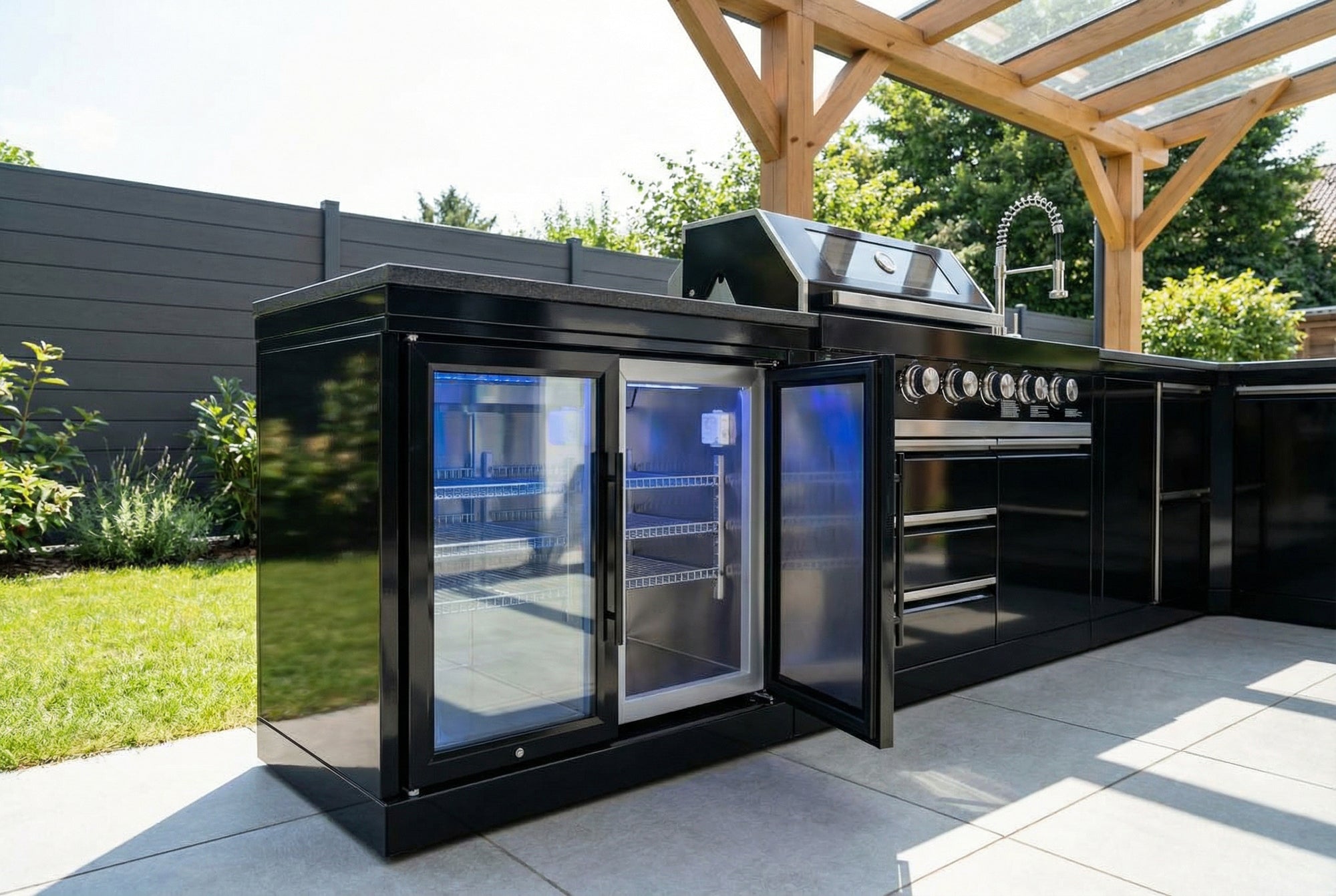 With a cooling capacity of 126 liters Two spacious refrigerators offer you enough room for large and small bottles, barbecue food, and fresh side dishes – no more running back and forth between the outdoor and indoor kitchens. Six cooling levels maintain the temperature precisely between 3 and 18°C, whether it's summer heat or cool evening air. And that's integrated door lock Ensures that drinks and supplies remain safely stored, so you can concentrate fully on grilling and your guests.