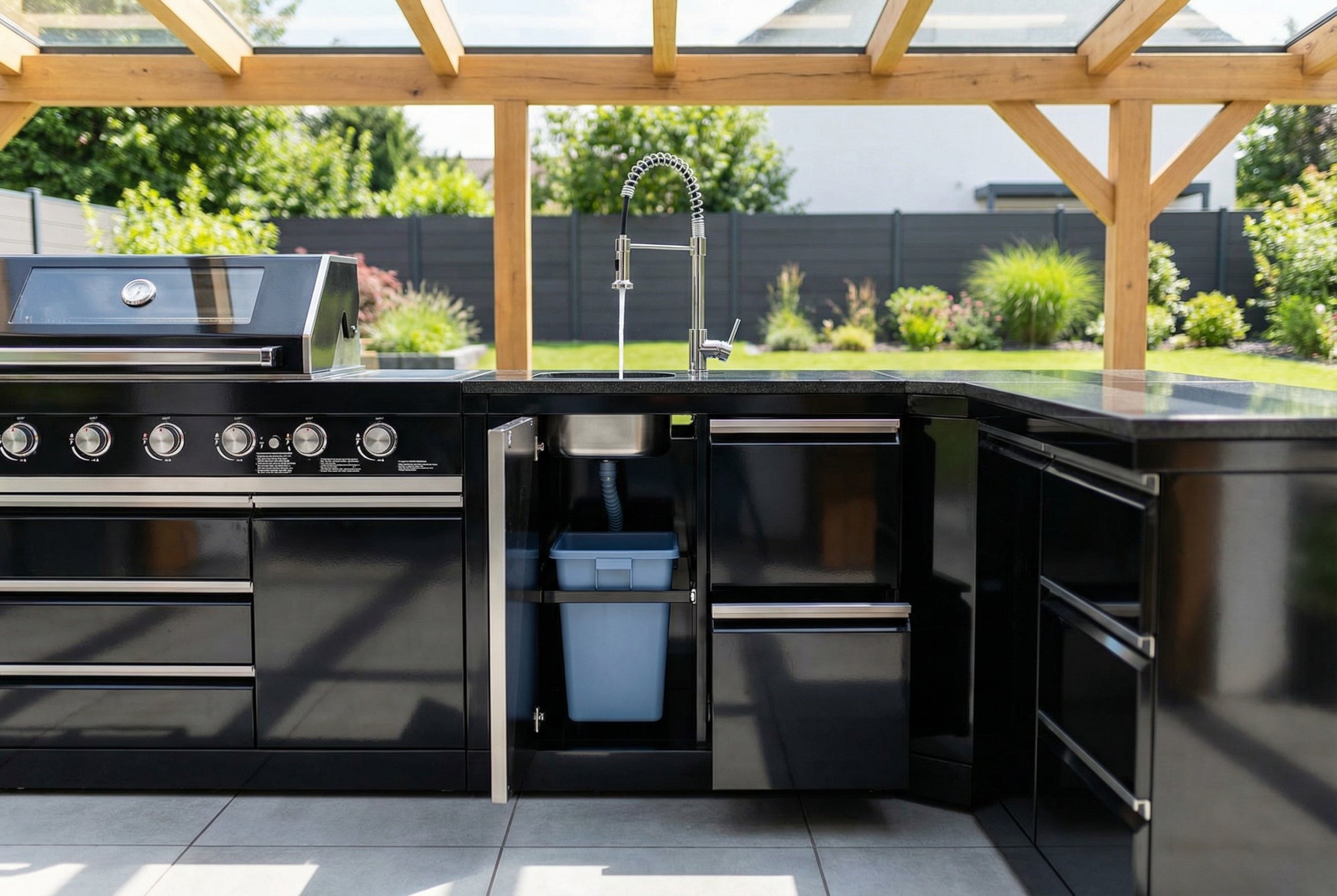 Dans le éviers profonds en acier inoxydable Vous pouvez laver les aliments, rincer la vaisselle ou nettoyer les grilles du barbecue – et après le barbecue, tout est impeccable en quelques secondes. Le robinet en acier inoxydable est facile à installer. douche puissante transforme le lavage des mains et le nettoyage en un jeu d'enfant. L'intégration, poubelles extensibles Votre espace de travail reste propre et accueillant, même après une longue soirée.