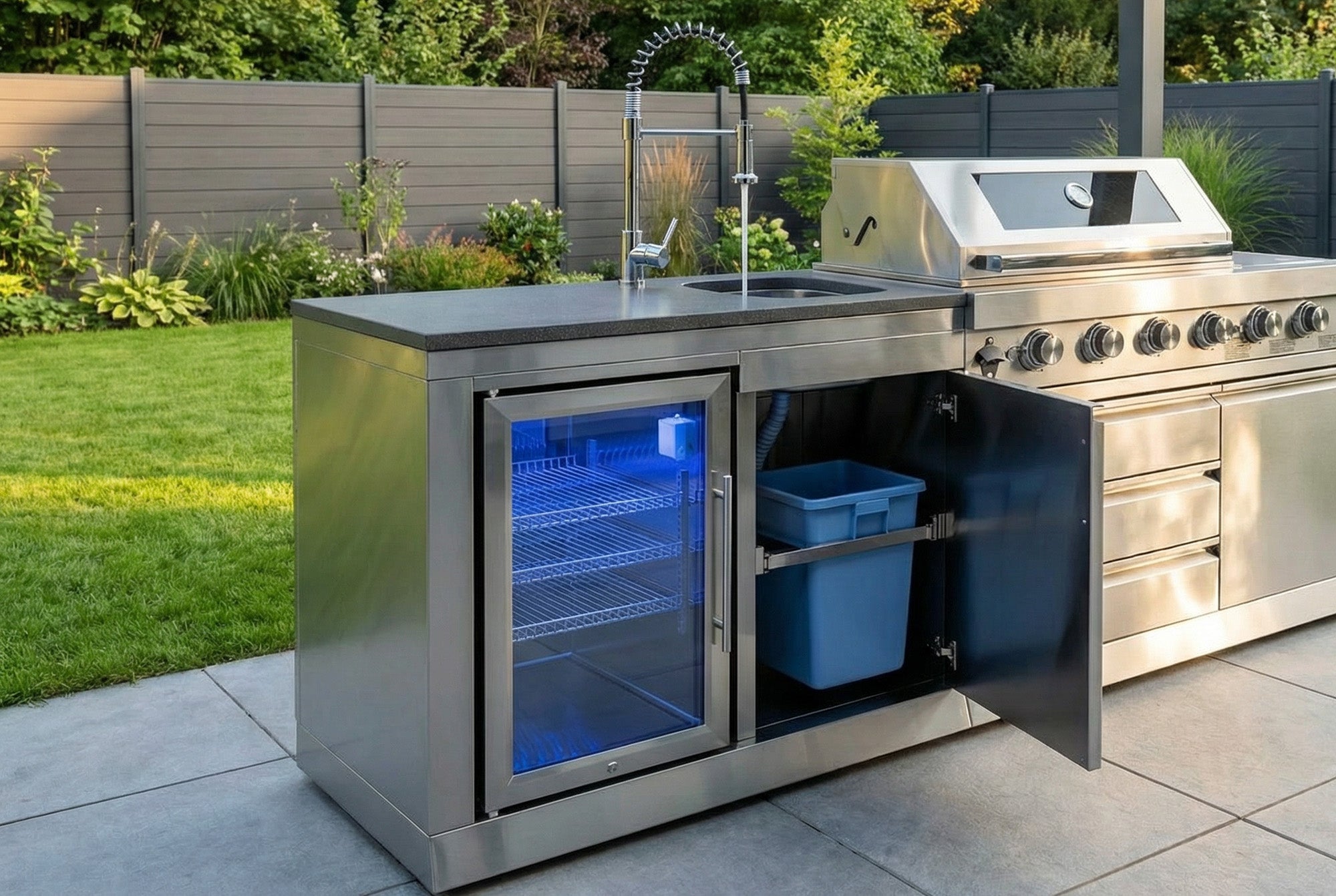 Con 63 litri di capacità di raffreddamento, ne avrai abbastanza. Spazio per un massimo di 10 bottiglie di vino, cibi alla griglia o contorni freschi, mantenuti costantemente refrigerati tra 3-18°C. Nel profondo, lavello in acciaio inox Puoi lavare il cibo, sciacquare i piatti o pulire le griglie del barbecue e, dopo il barbecue, tutto sarà pulito e splendente in pochi secondi. Il sistema integrato, contenitori estensibili per rifiuti Mantiene il tuo spazio di lavoro ordinato e invitante, anche dopo una lunga serata.