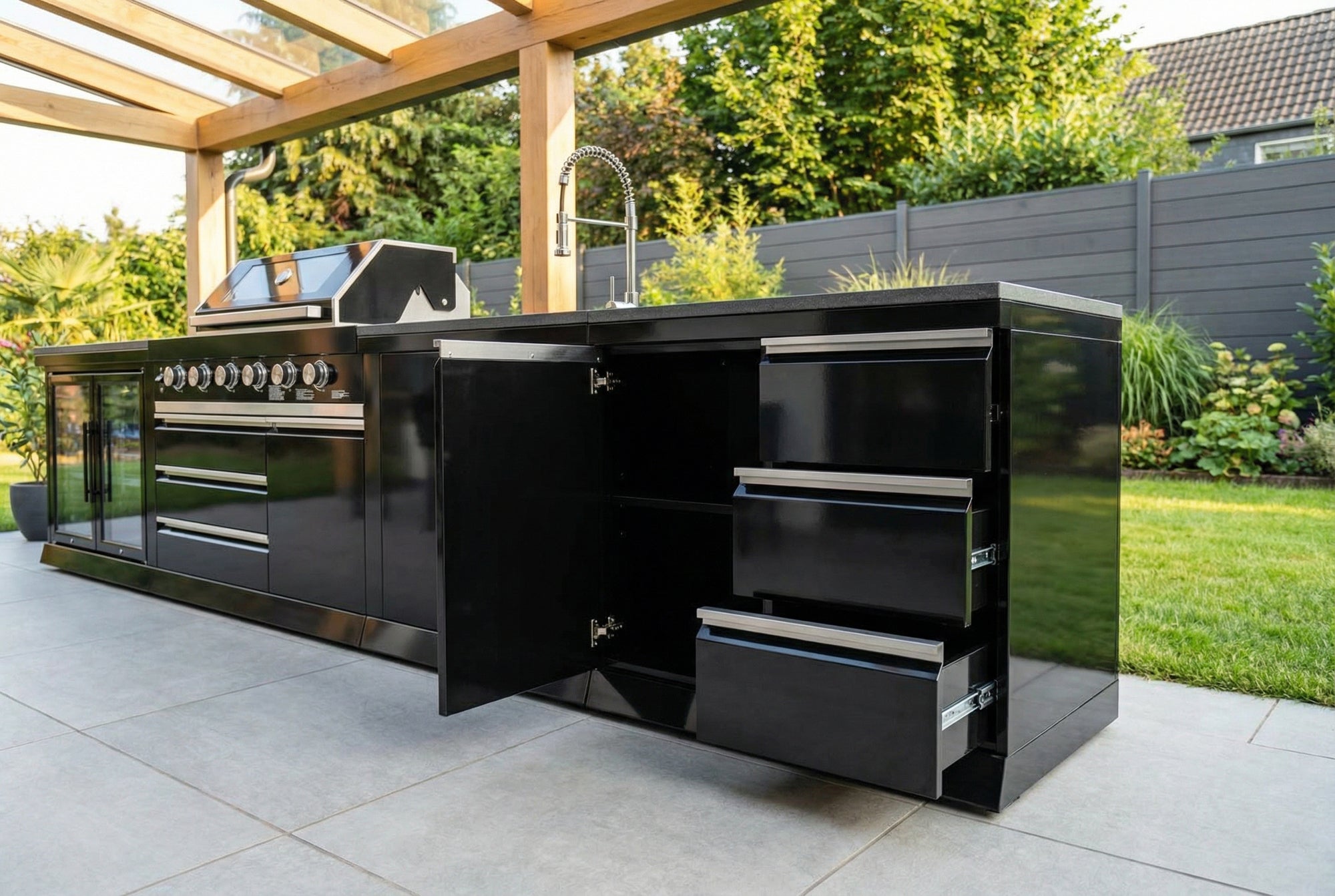 Mit ihrem klaren Aufbau verleiht die BB-L1 deinem Garten eine elegante Selbstverständlichkeit. In dieser Outdoorküche hast du alles, was du im Outdoor-Cooking brauchst, stilvoll zusammengesetzt in einer geraden Linie.