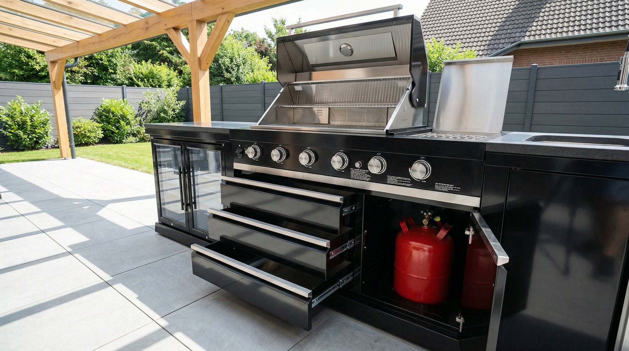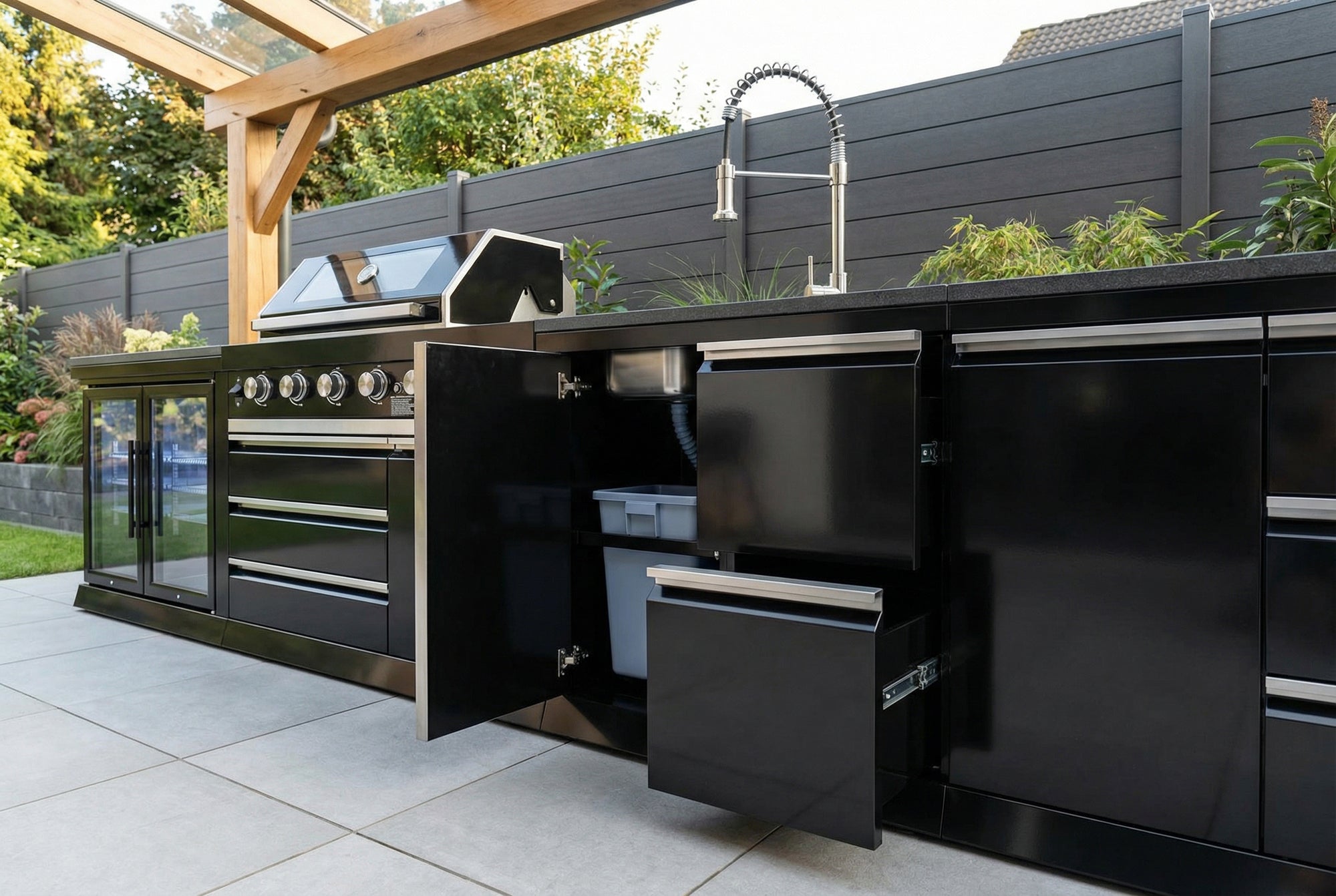 Im tiefen, rostfreien Spülbecken kannst du Lebensmittel waschen, Teller spülen oder Grillroste reinigen – und nach dem Grillabend ist es in Sekunden wieder blitzblank gewischt. Die einfach anzuschließende Edelstahl-Armatur mit kräftiger Brause macht Händewaschen und Saubermachen zum Kinderspiel. Der integrierte, ausziehbare Abfalleimer hält deinen Arbeitsplatz aufgeräumt und einladend, auch nach einem langen Abend.