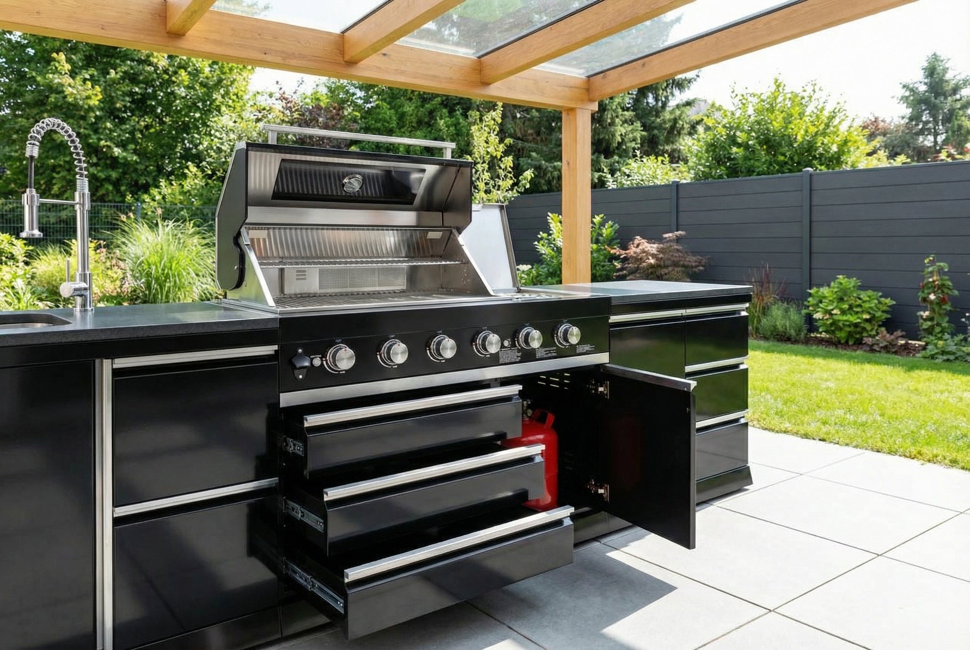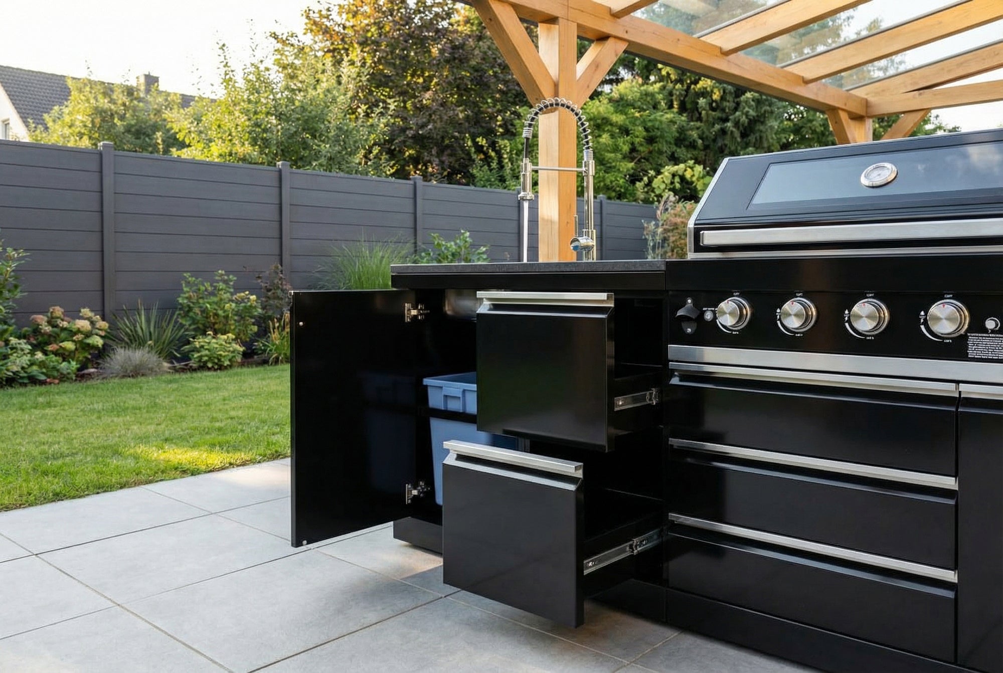 Im tiefen, rostfreien Spülbecken kannst du Lebensmittel waschen, Teller spülen oder Grillroste reinigen – und nach dem Grillabend ist es in Sekunden wieder blitzblank gewischt. Die einfach anzuschließende Edelstahl-Armatur mit kräftiger Brause macht Händewaschen und Saubermachen zum Kinderspiel. Der integrierte, ausziehbare Abfalleimer hält deinen Arbeitsplatz aufgeräumt und einladend, auch nach einem langen Abend.