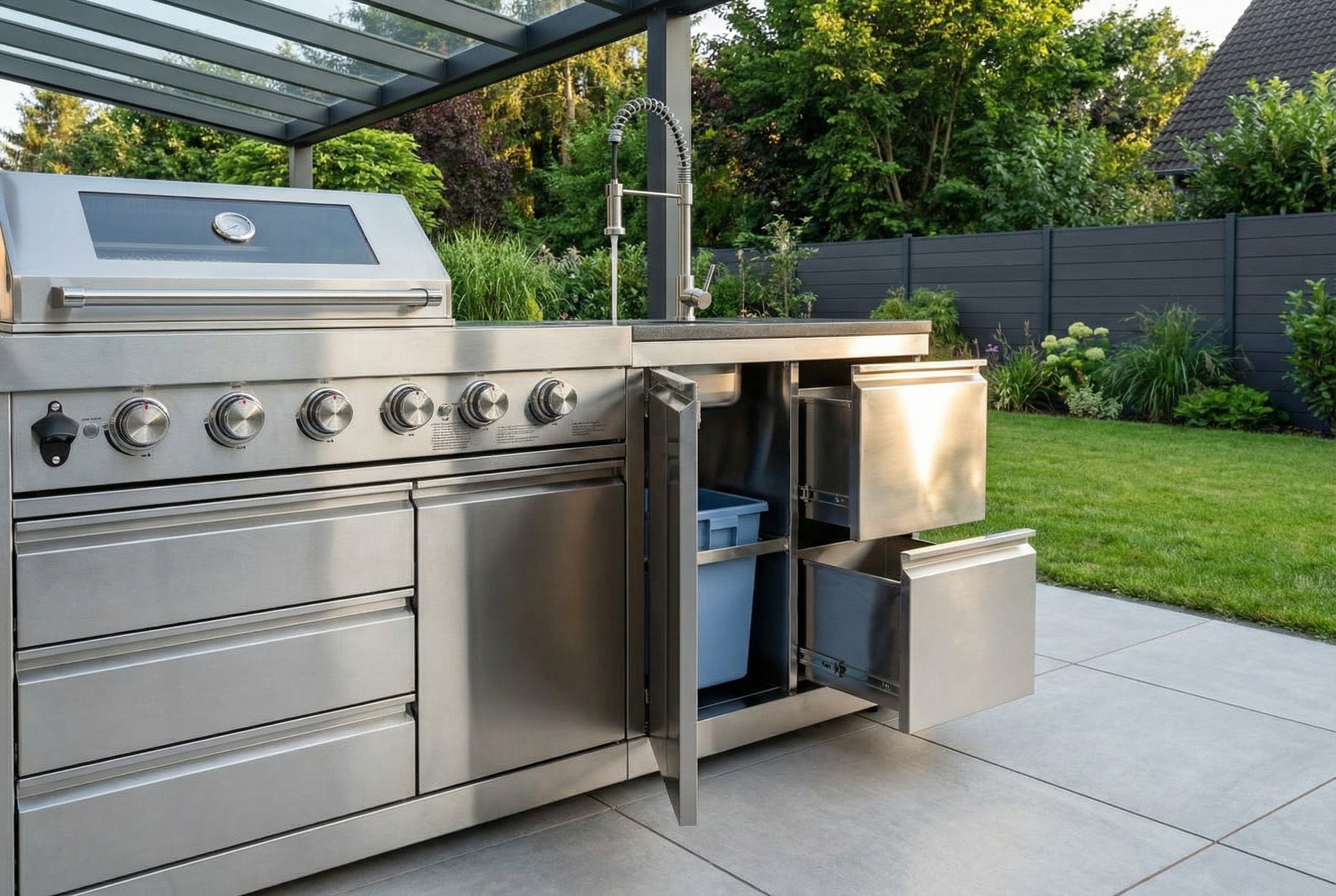 Im tiefen, rostfreien Spülbecken kannst du Lebensmittel waschen, Teller spülen oder Grillroste reinigen – und nach dem Grillabend ist es in Sekunden wieder blitzblank gewischt. Die einfach anzuschließende Edelstahl-Armatur mit kräftiger Brause macht Händewaschen und Saubermachen zum Kinderspiel. Der integrierte, ausziehbare Abfalleimer hält deinen Arbeitsplatz aufgeräumt und einladend, auch nach einem langen Abend.