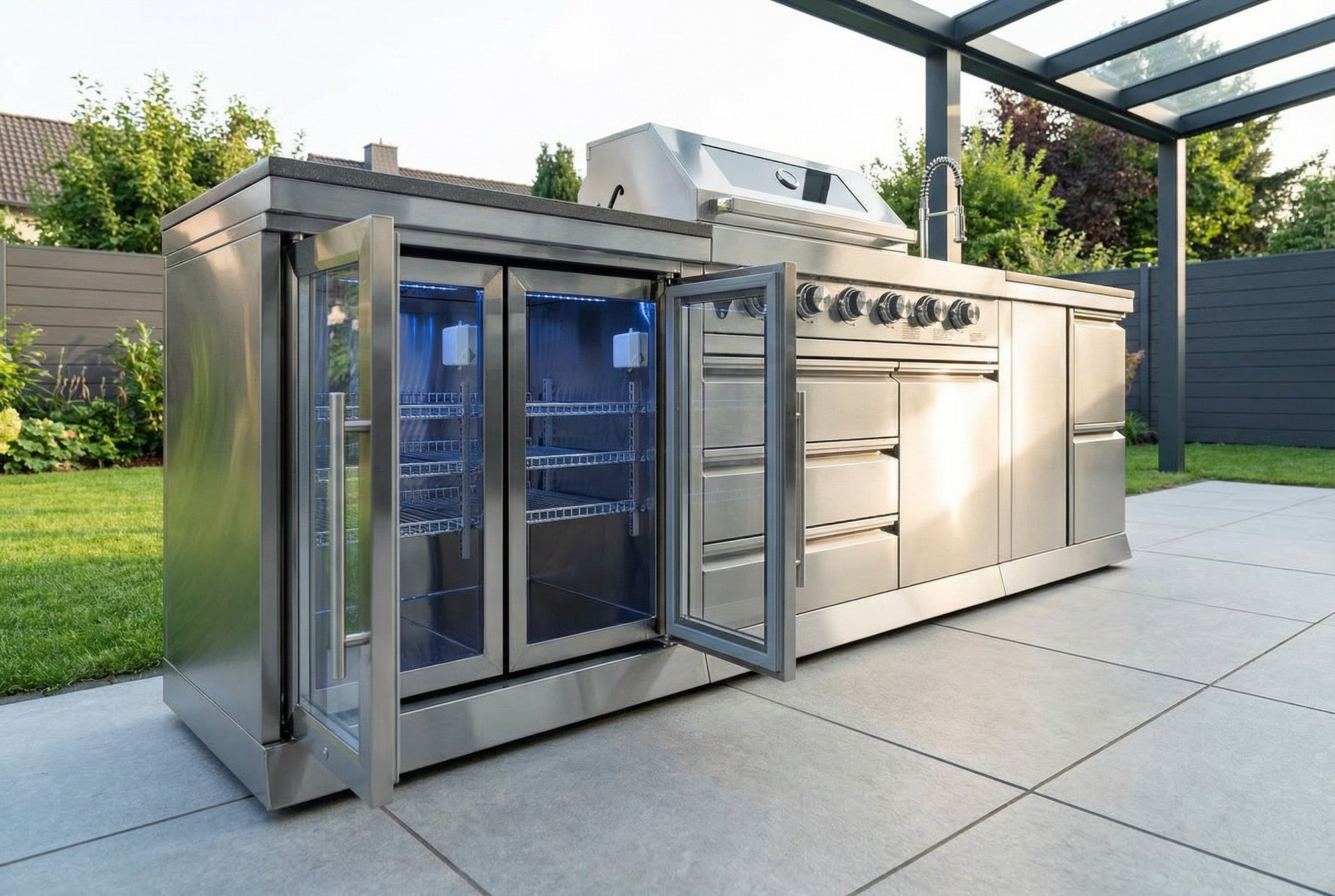 Mit 126 Litern Kühlvolumen bieten dir zwei geräumige Kühlschränke genug Platz für große und kleine Flaschen, Grillgut und frische Beilagen – kein Hin- und Herlaufen mehr zwischen Außen- und Innenküche. Sechs Kühlstufen halten die Temperatur präzise zwischen 3–18°C, egal ob Sommerhitze oder Abendkühle. Und das integrierte Türschloss sorgt dafür, dass Getränke und Vorräte sicher verstaut bleiben, damit du dich ganz aufs Grillen und deine Gäste konzentrieren kannst.