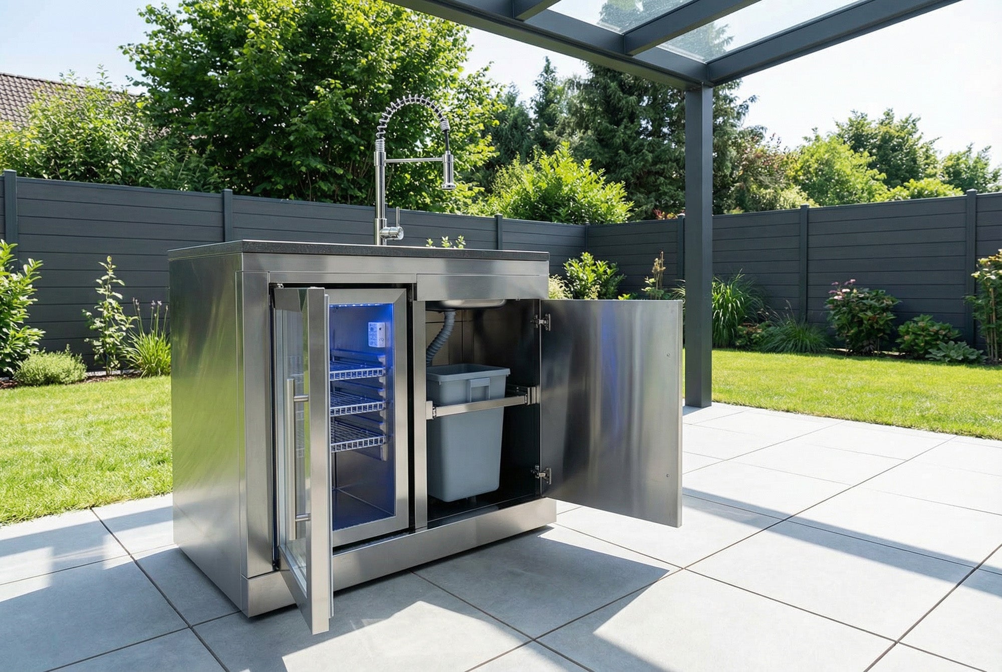 Massiver Edelstahl, veredelt mit einer Granit-Arbeitsplatte – gebaut für den 24/7 Einsatz in jeder Jahreszeit.